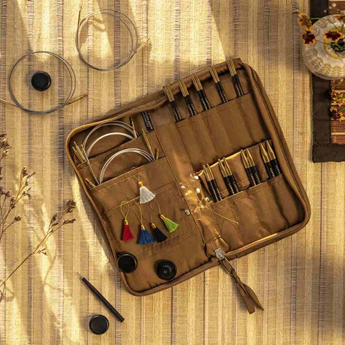 Inside, there is space for several interchangeable needle tips and strings. The zippered pouch keeps everything safely stored and organized.