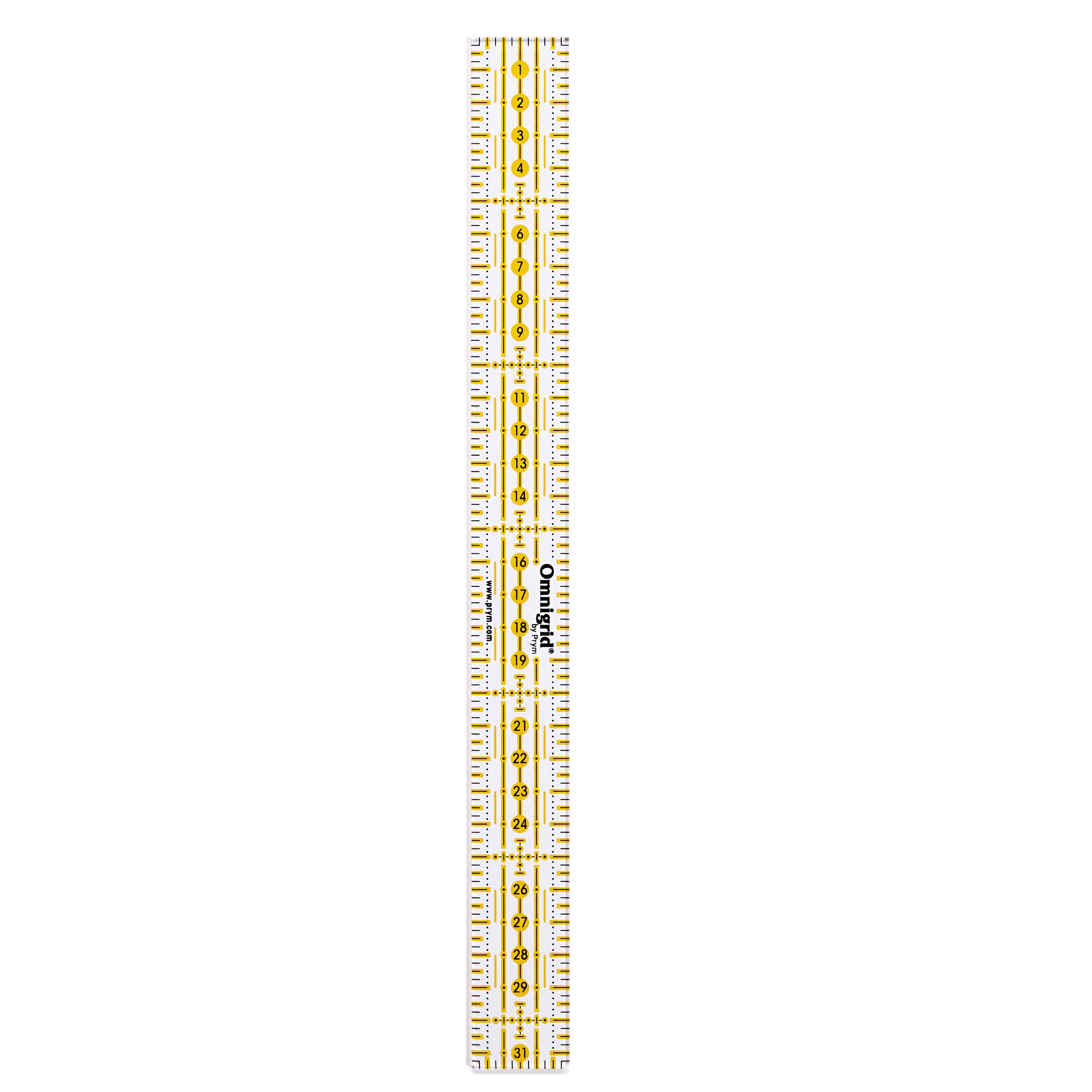 Universal ruler for sewing. Handy for small pieces of fabric. With 30°, 45° and 60° angle markings.