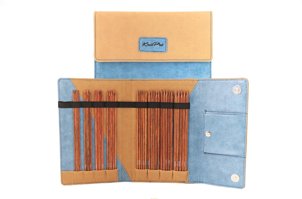 Ginger Wooden Sock Needle Set - 40 needles, 8 sizes (5 needles in each size), packed in a Premium needle case in denim and beige.