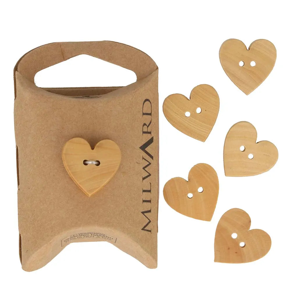 Šīs skaistās Milward pogas ir neticami daudzpusīgas: tās var izmantot apģērbam, mājas dekoru priekšmetiem, kā arī aksesuāriem. Šīs sirdsveida koka dabīgās pogas var piešūt ar rokām caur diviem caurumiem. Pogas ir 18 mm platas.