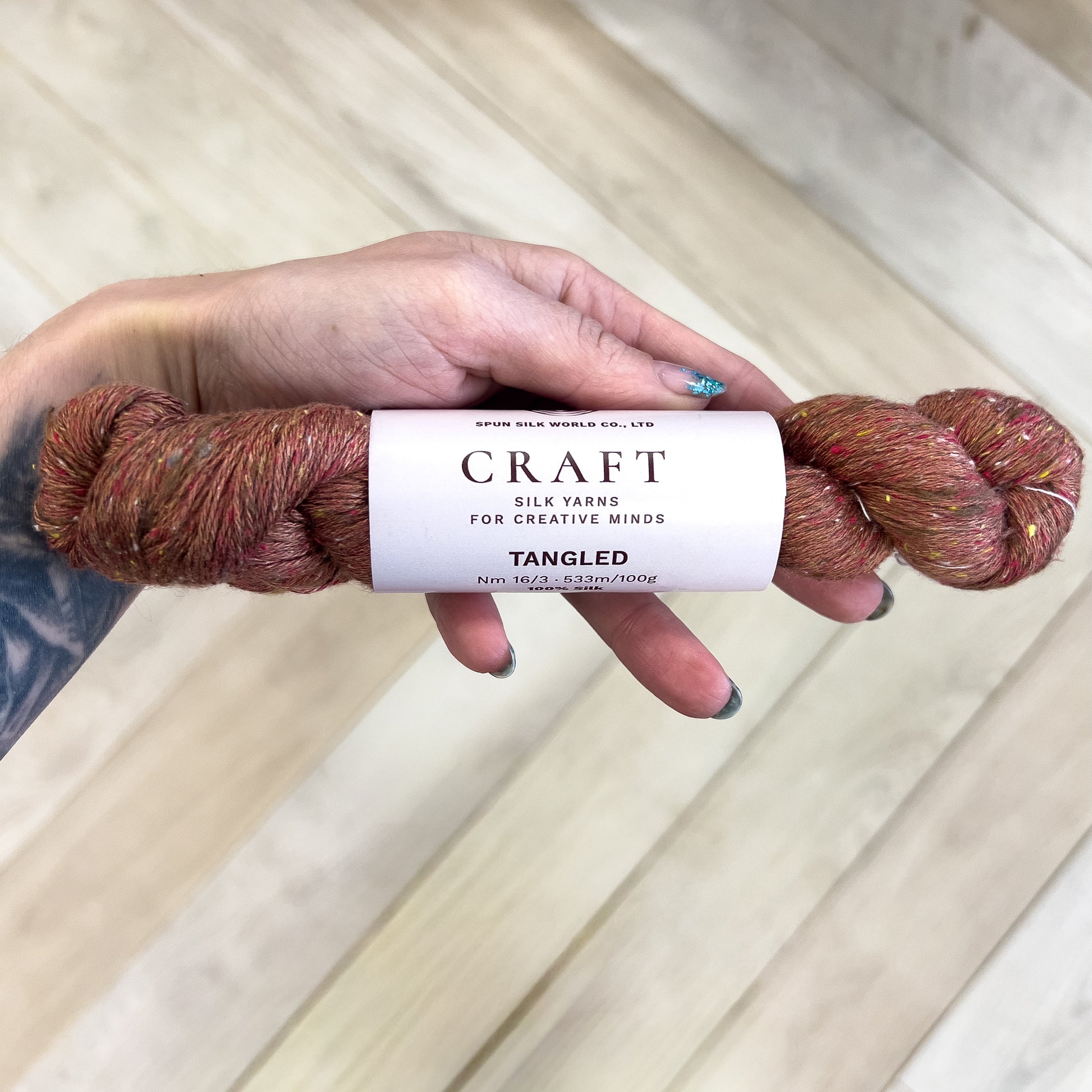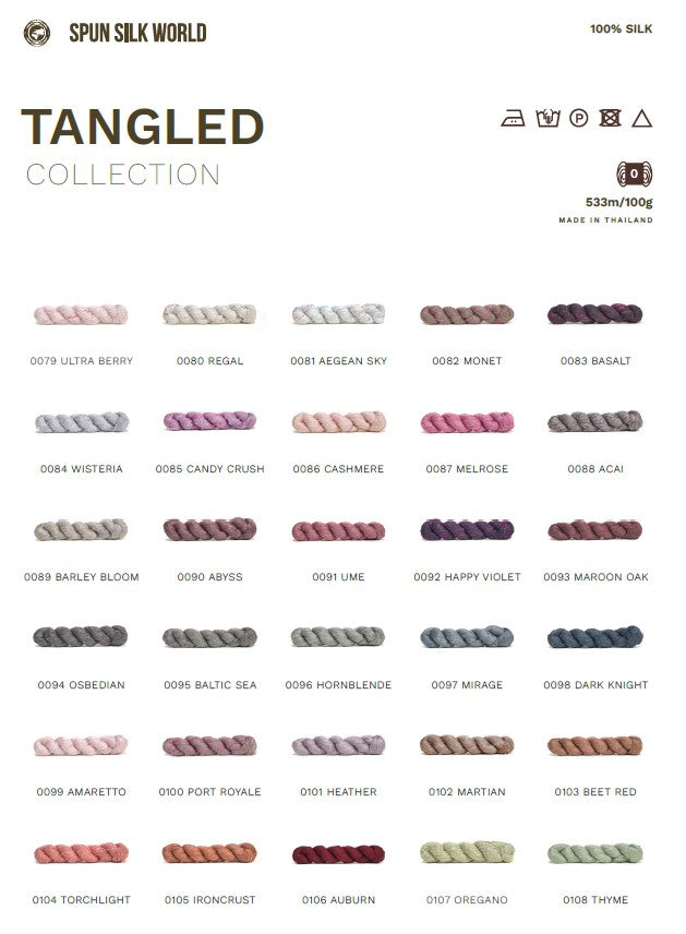 Tangled kolekcija, kas izgatavota no nepārtrauktiem pavedieniem, kas iegūti no Bombyx mori zīdtārpiņa iekšējā kokona, izceļas ar gludu, dabiski spīdīgu virsmu. Šķiedras garums nodrošina izcilu vienmērīgumu, samazina pūkošanos un atvieglo ažūra dūrienu vai smalka adījuma veidošanu.
