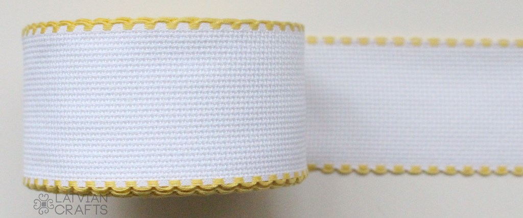 White Zweigart Aida ribbon for embroidery and other needlework with yellow edge trim.