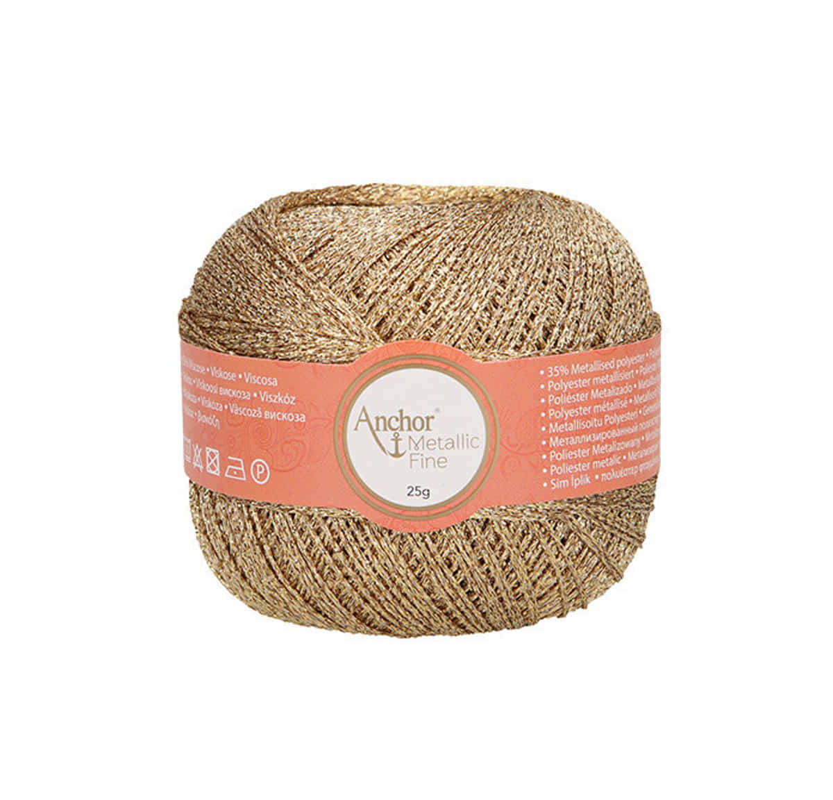 Anchor Metallic Fine is thin and delicate yarn made from a blend of viscose (65%) and metallized polyester (35%), which gives it a gorgeous shimmering effect.