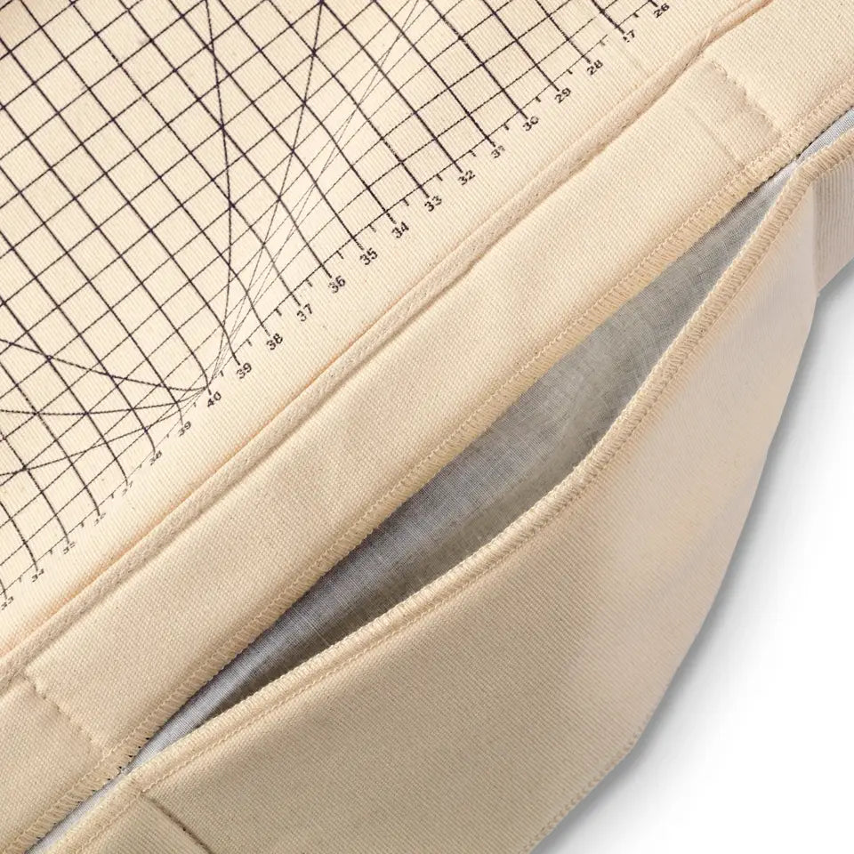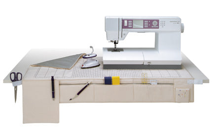 Multifunctional ironing board with centimeter and angle markings. Also has sorting/separating loops and pockets, a pin cushion and a removable pocket.
