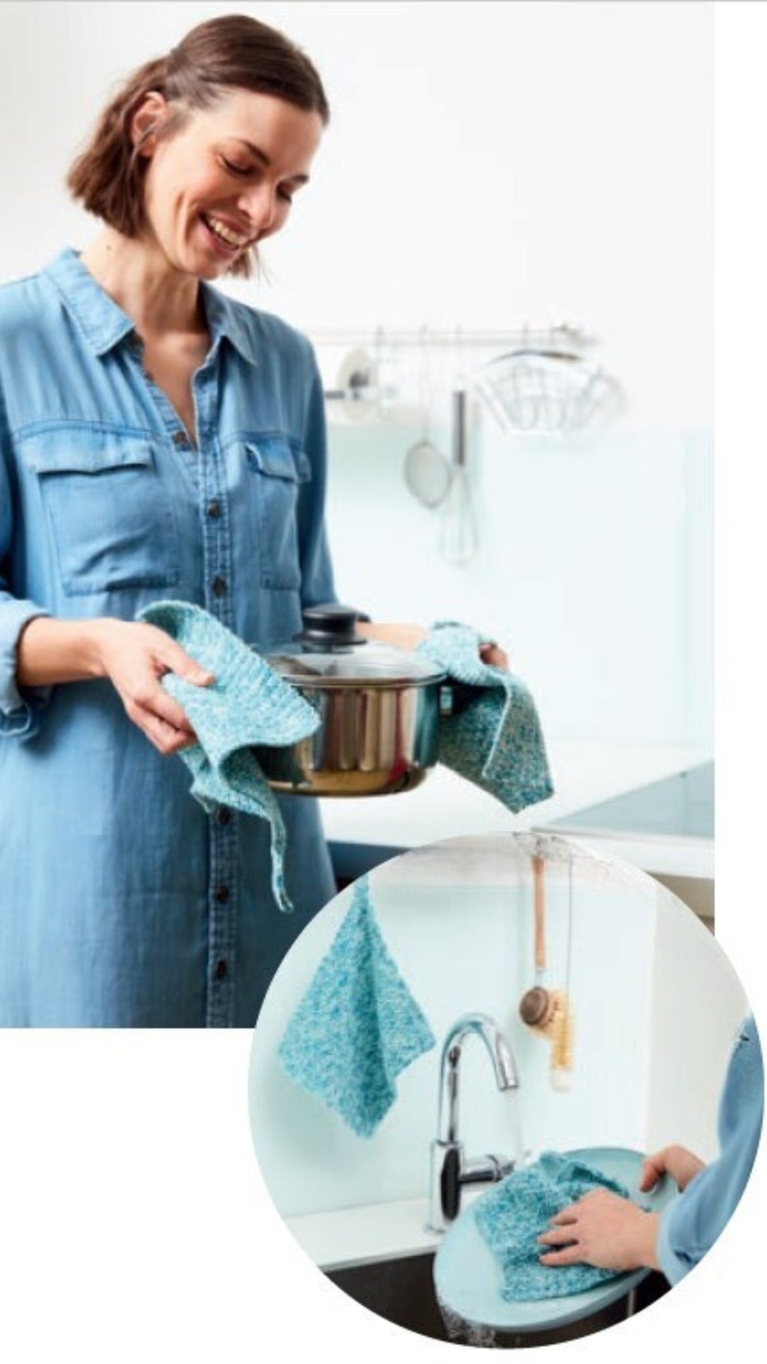 Instructions for the pot holder and cleaning cloths in English can be found at schachenmayr.com