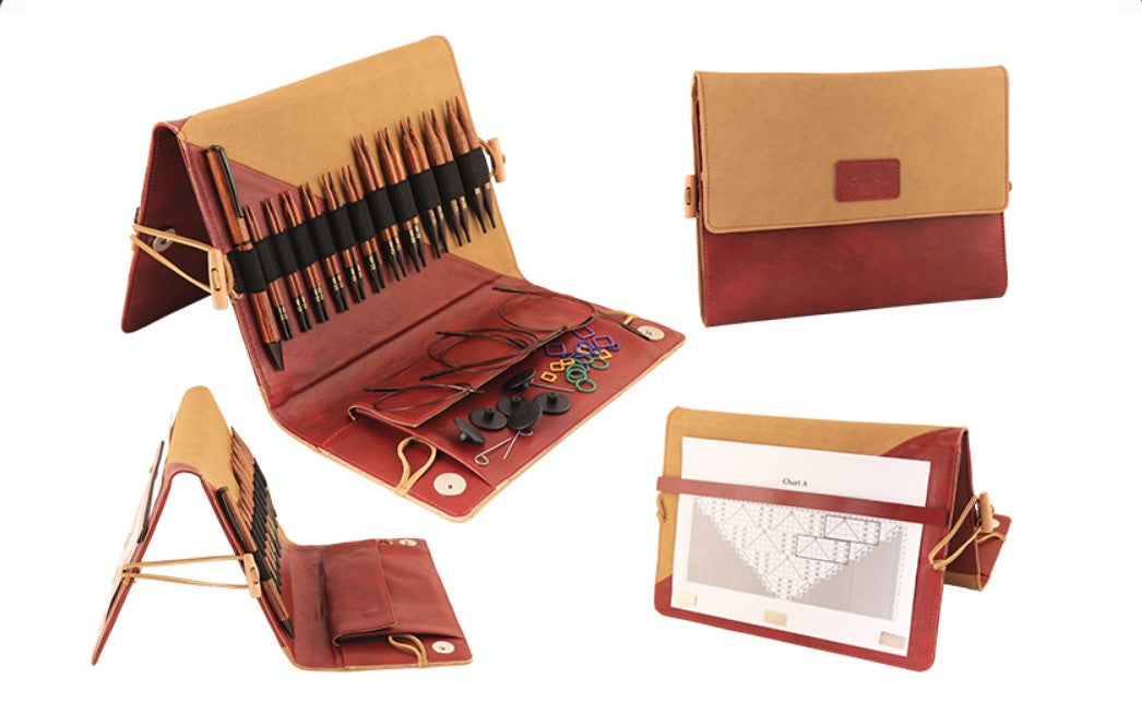 Set of 22 Ginger interchangeable circular needles (11 sizes - 2 needle tips per size), packaged in a Premium needle case in burgundy and beige, with a knitting chart holder.
