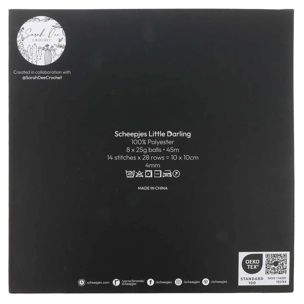 Little Darling krāsu komplektus ekskluzīvi veido Sarah Dee Crochet, Scheepjes Designer Collective dalībniece. Katrā krāsu komplektā ir pietiekami daudz dzijas dažādās krāsās, lai radītu mīlīgus un krāsainus darinājumus. Sāras paraugus var iegādāties, izmantojot QR kodu uz katra krāsu komplekta, lai varētu nekavējoties sākt darbu pie saviem darinājumiem.