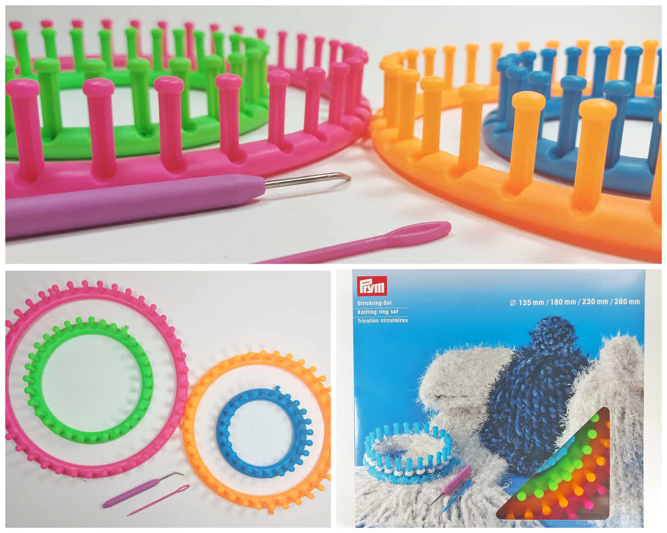 1 Pink circle - 28cm diameter, 41 pins, maximum width of straight knitting ~85cm