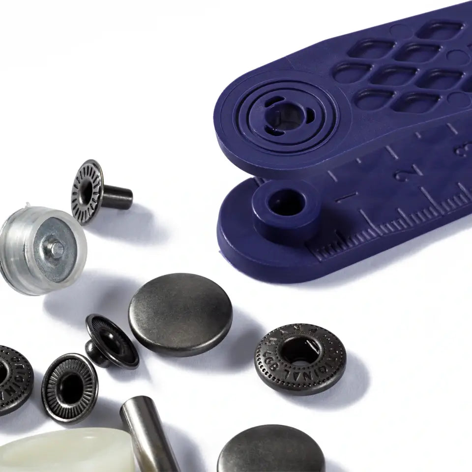 The set includes 10 snap buttons (metal) for outerwear and a pressing tool (plastic) + instructions.