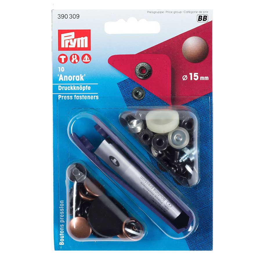 The set includes 10 snap buttons (metal) for outerwear and a pressing tool (plastic) + instructions.