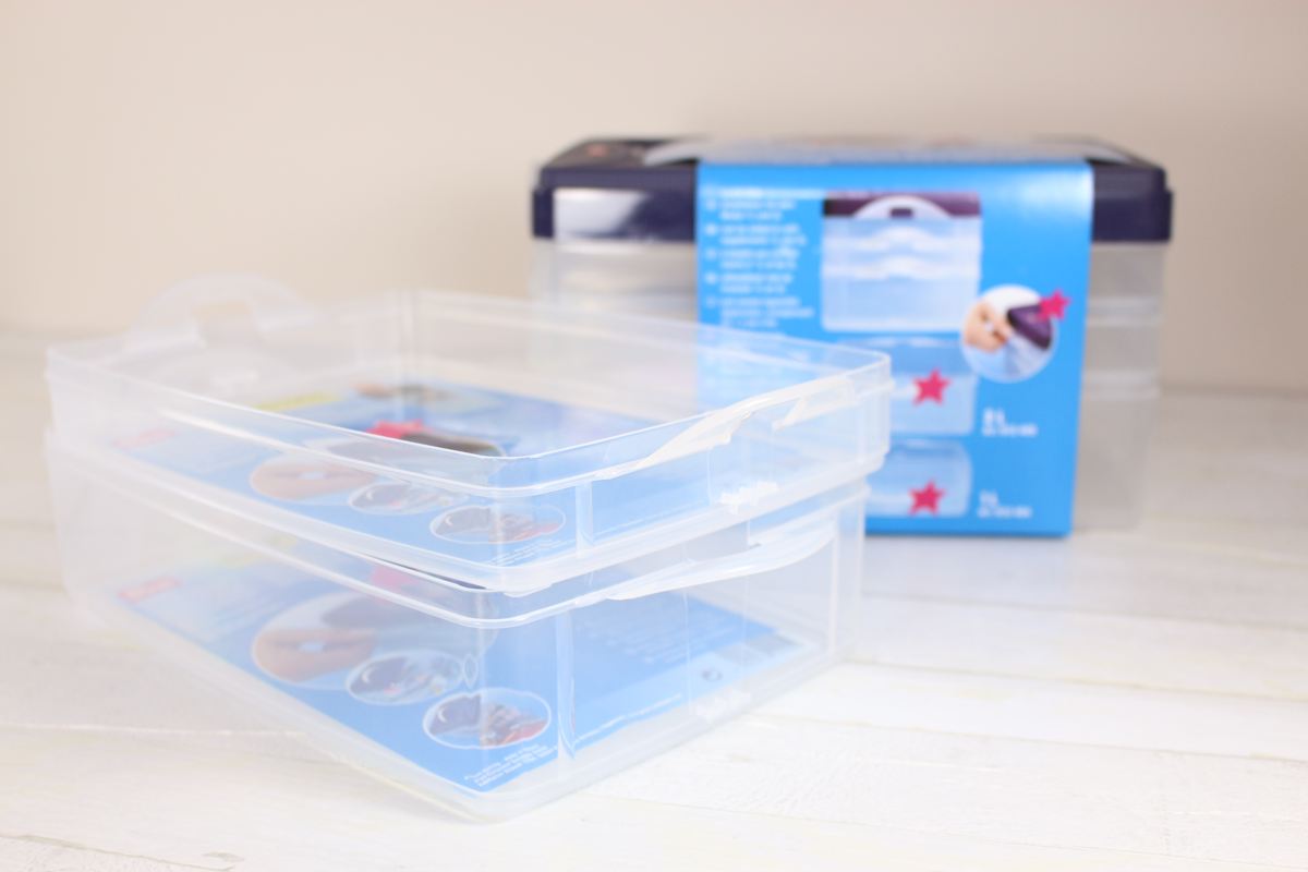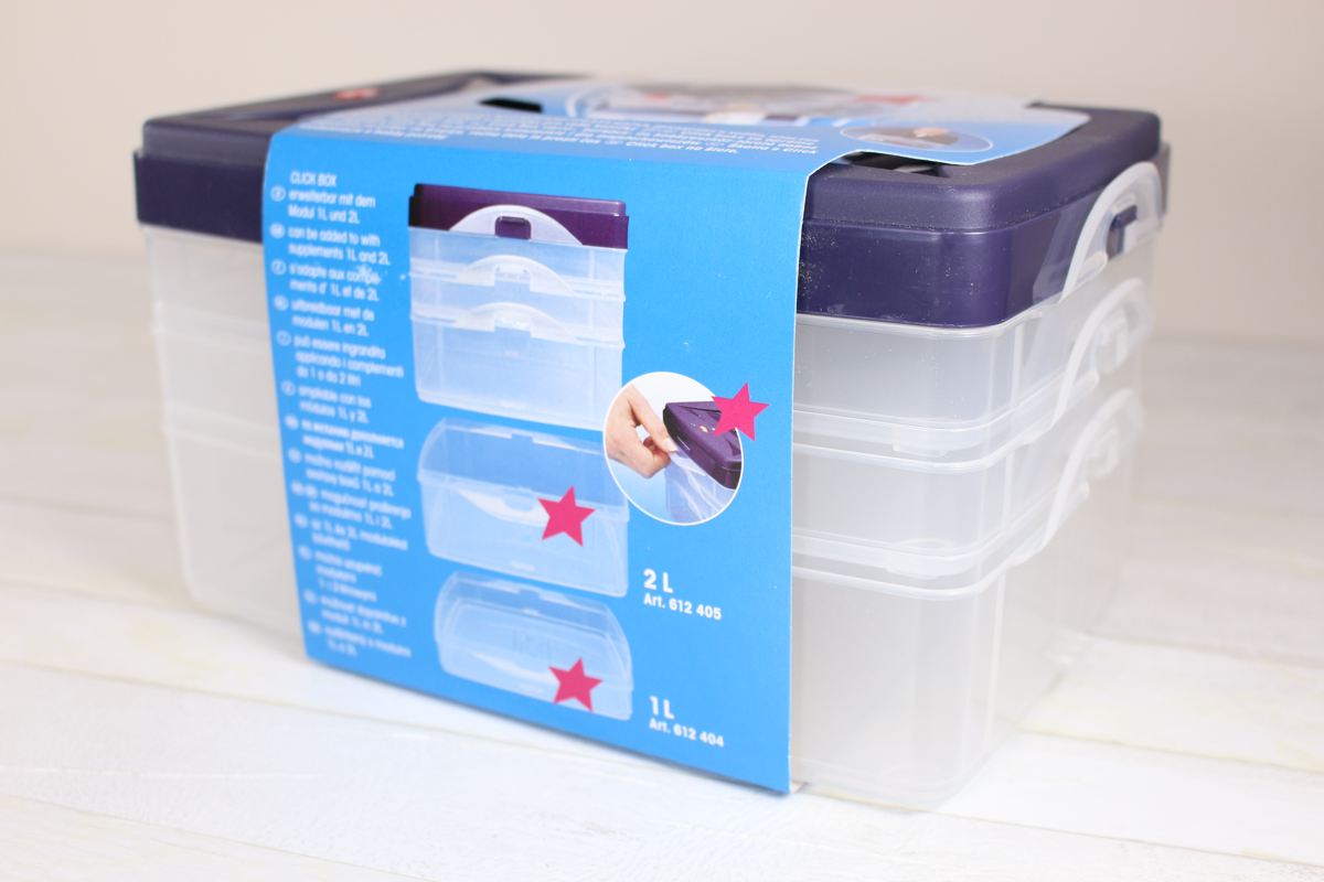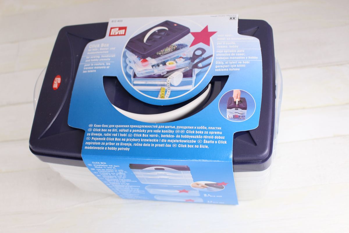 A stackable box for storing and transporting supplies for sewing, crafts or other hobbies.
