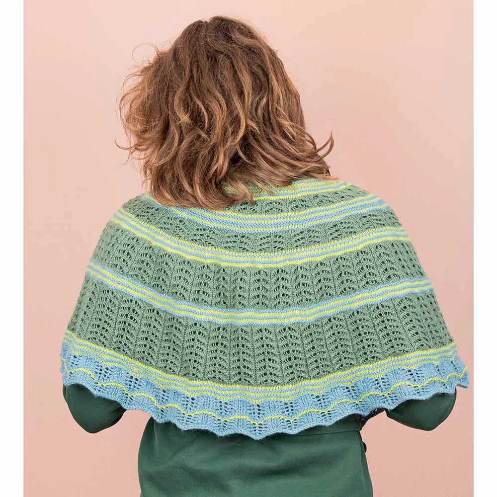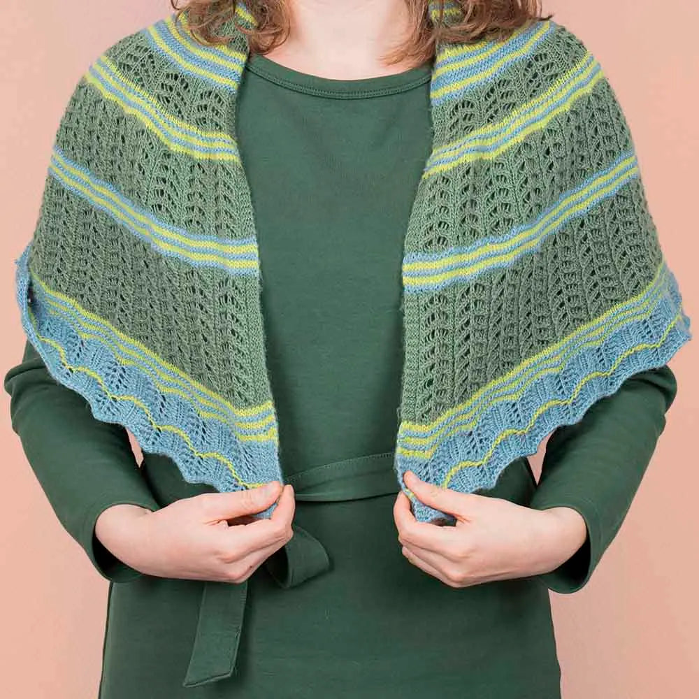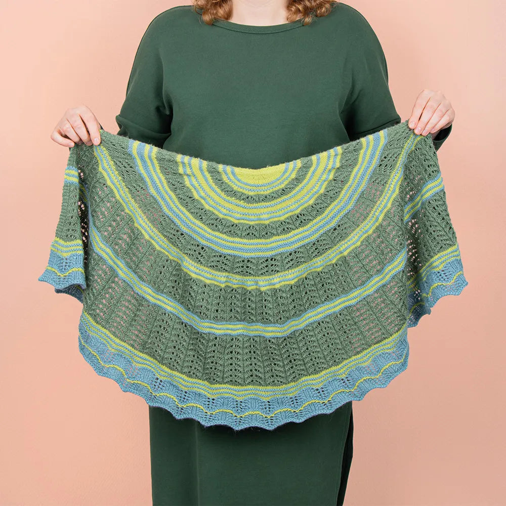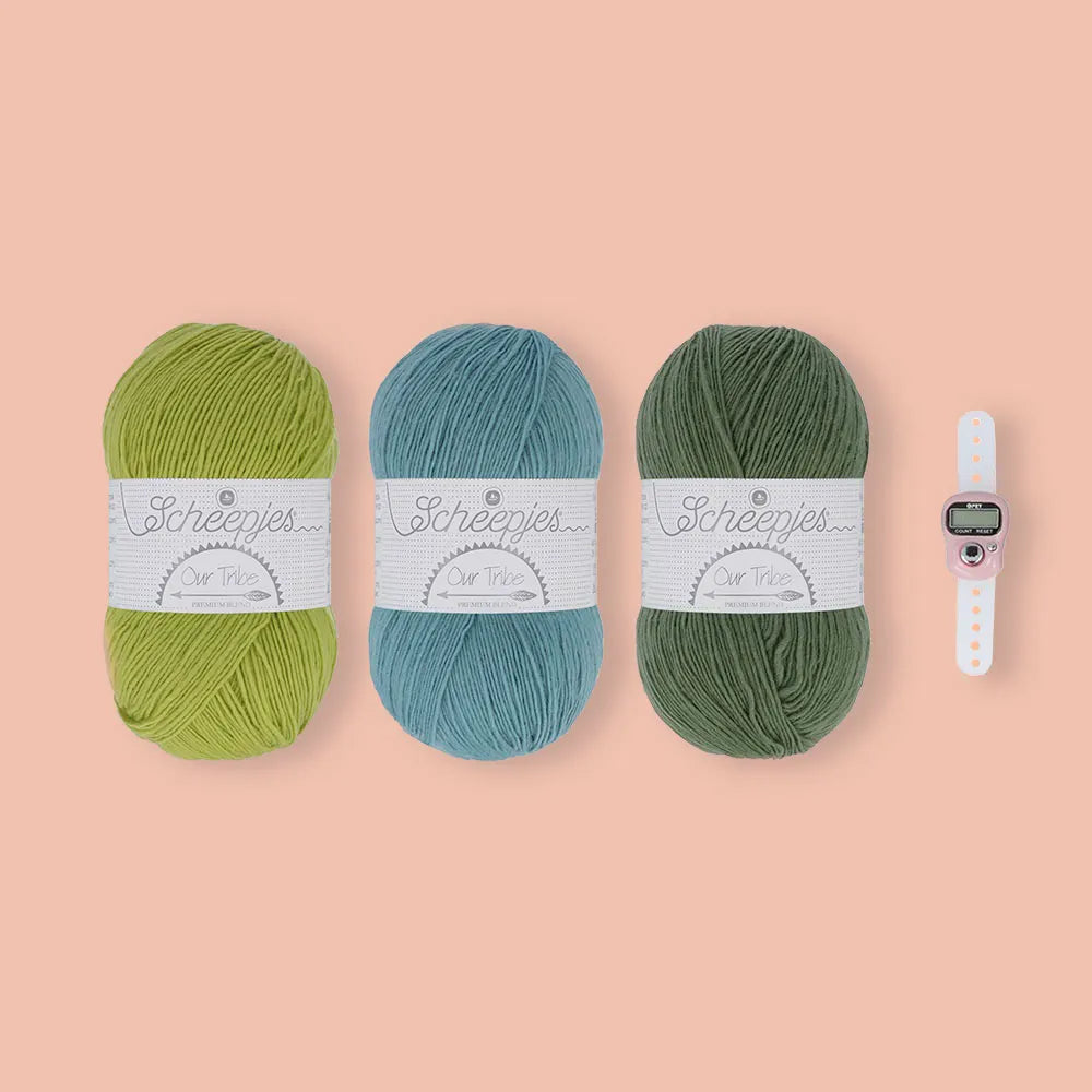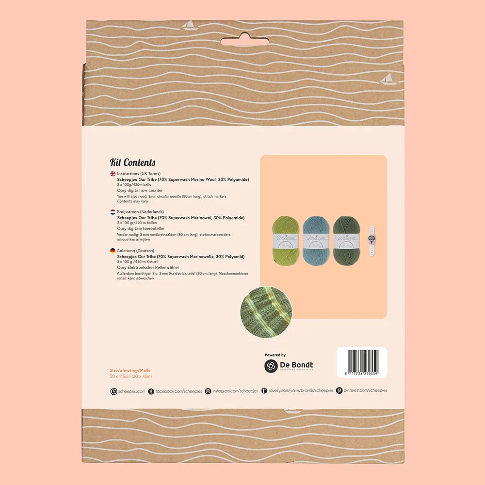 The beautiful half-circle scarf is knitted from Scheepjes Our Tribe, a wonderfully soft and lightweight yarn made from 75% Superwash merino wool and 25% polyamide.