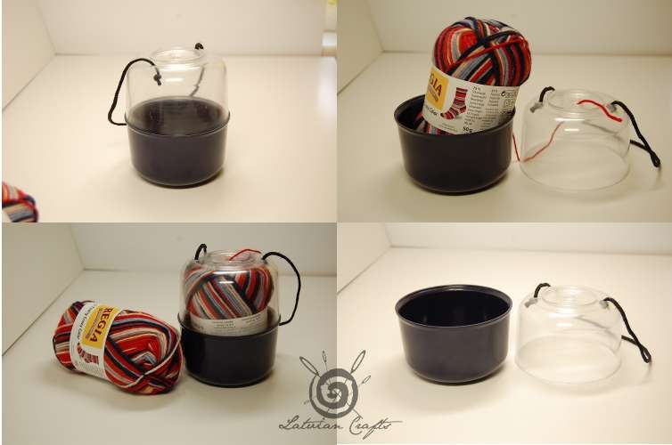 A container with a hole for feeding yarn, which holds 50g of standard yarn skeins.