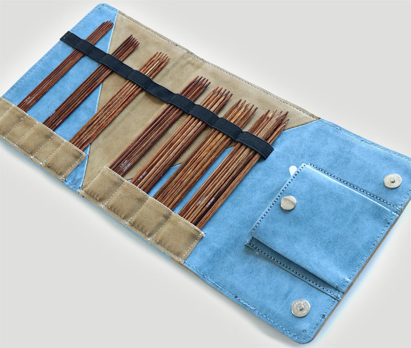 Gingeri puidust sokinõelte komplekt - 7 suurust (5 nõela igas suuruses), pakendatud teksariidest ja beežist kvaliteetsesse nõelakarpi.