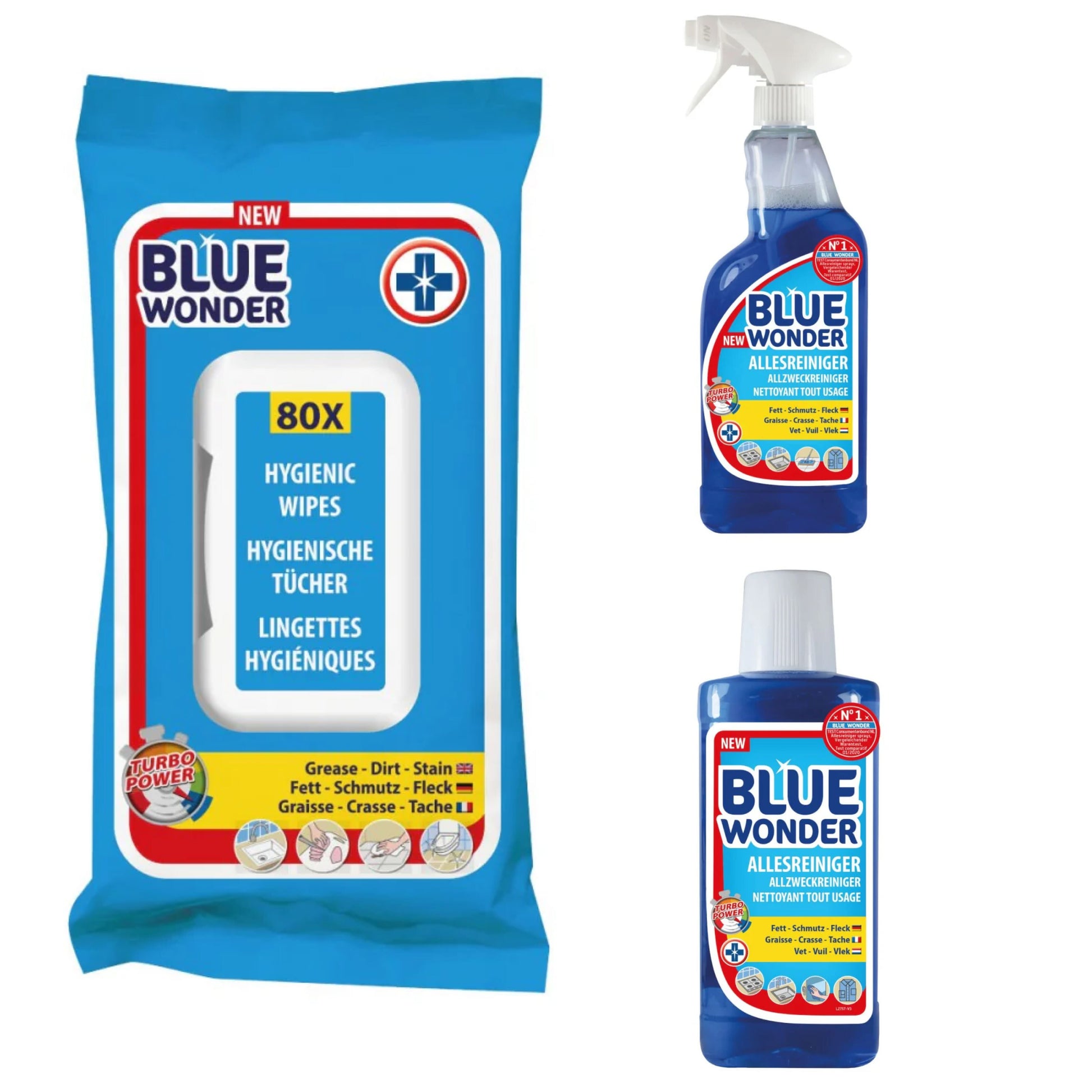 BLUE WONDER tīrīšanas komplekts: Mitrās salvetes + Universāls tīrītājs SPREJS + KONCENTRĀTS